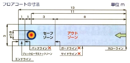 ハンドルを軽く握り、片膝又は、両膝をついた姿勢で床面でジェットローラを2~3回前後に滑らせ目標に向かい押し出すように投球する。手がラインを越えてもアウトにはならないが、立ったり、走りながらの投球、足がラインを越えた場合はアウトになる。