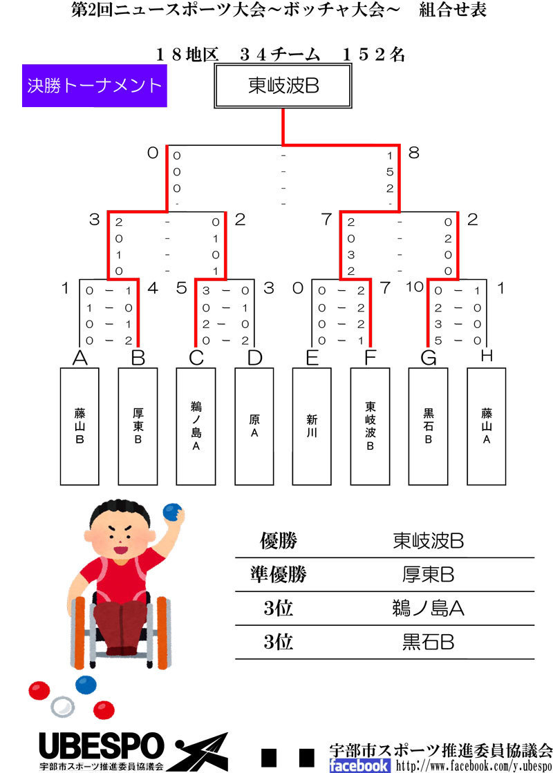 1月19日(日)西部体育館で18地区から31チームが参加し第2回宇部市民ボッチャ大会を開催しました。インフルエンザ感染により残念ながら昨年度より1地区参加地区が少なくなりましたが、今年は特に子ども達の参加が増えて参加者は小学生からご高齢の方まで幅広い世代の皆さまのご参加がありました。優勝は東岐波地区Bチーム、準優勝は厚東地区Bチーム、3位が、鵜ノ島Aチームと黒石地区Bチームとなりました。